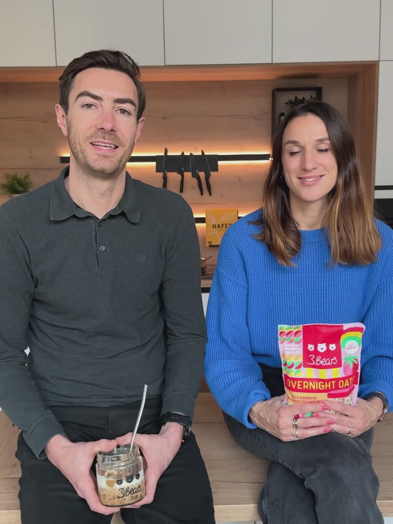 3Bears wurde 2016 von Caro und Tim gegründet, um eine leckere Frühstücksalternative zu den vielen zuckerhaltigen Optionen zu bieten. Wir haben Porridge nach Deutschland gebracht, weil es perfekt zu unserer Mission passt: We Create Tasty Oat Products for a Better Life. Heute bieten wir ein komplettes Sortiment an Haferprodukten an, darunter Overnight Oats, Haferriegel, Granola, Nussmuse und Zubehör. Unsere Vision ist es, die Hafermarke in jedem Haushalt zu werden, und wir bleiben unseren Werten treu, indem wir sicherstellen, dass unsere Produkte frei von industriellem Zucker und künstlichen Zusatzstoffen sind und zu 100 % auf pflanzlicher Basis hergestellt werden.