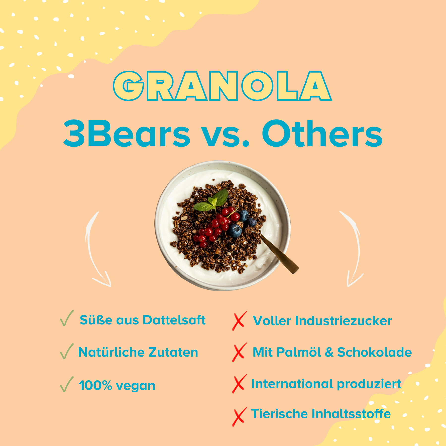 In der Vergangenheit habe ich schon öfters mit 3Bears im Rahmen von Kooperationen zusammengearbeitet. 3Bears teilt meine Leidenschaft für hochwertige Lebensmittel, die nicht nur mega lecker, sondern auch vollwertig sind. Deswegen war ich so begeistert von der Idee ein Granola zu entwickeln, das genau diese beiden Komponenten miteinander vereint – es ist komplett ohne Industriezucker hergestellt und schmeckt wie selbst gebacken!