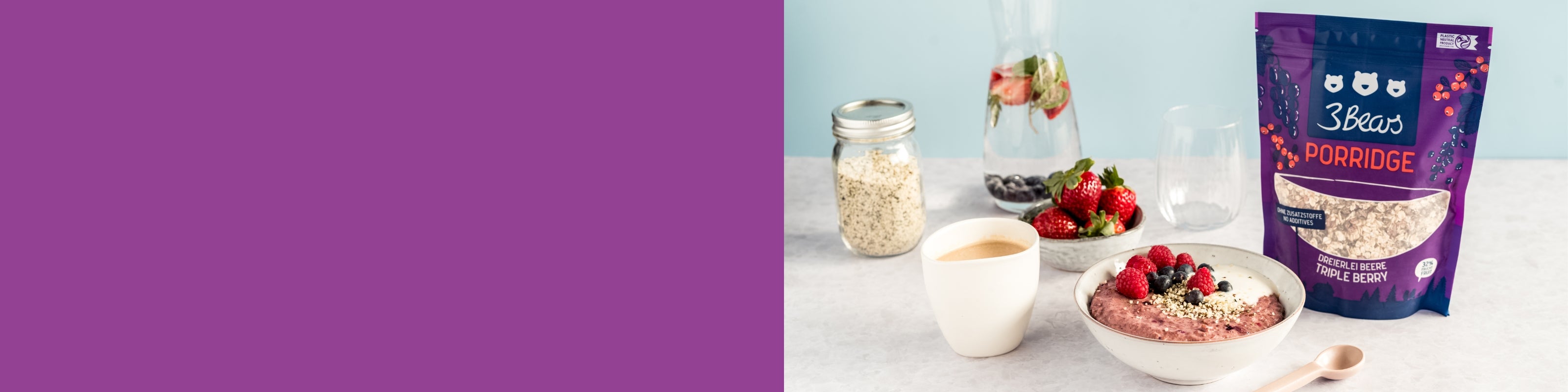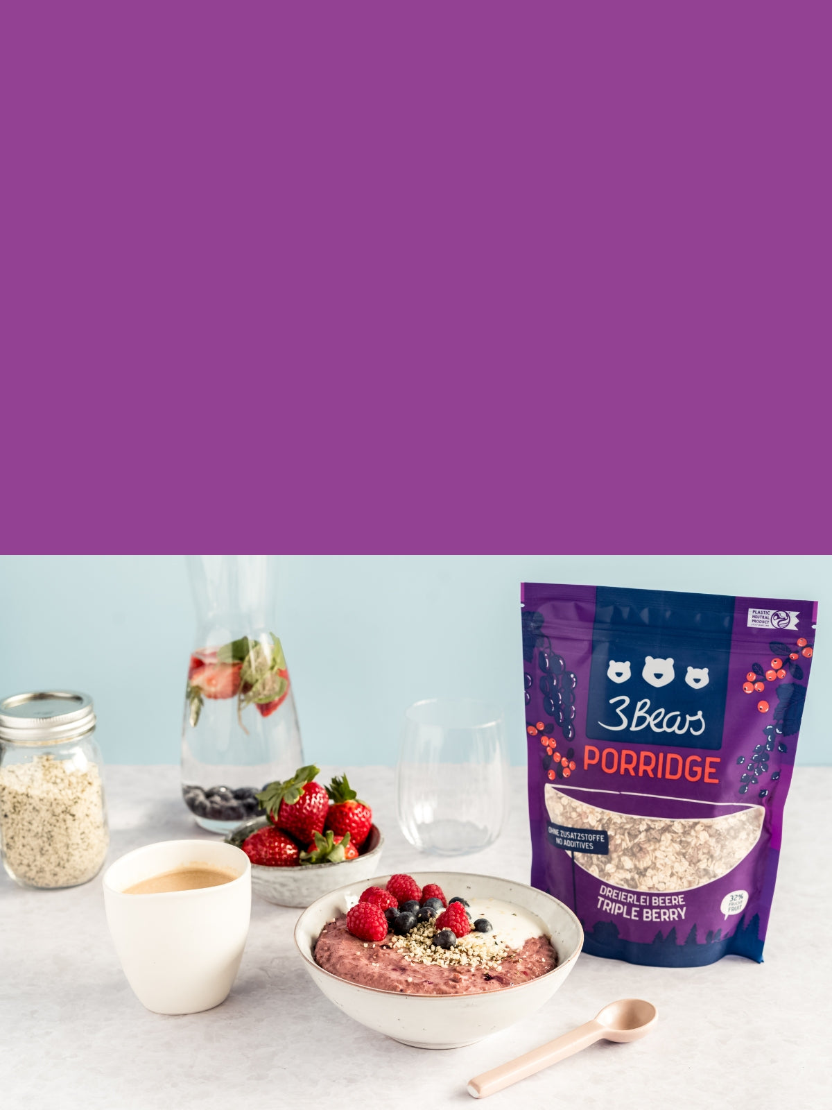 2016 gründeten wir 3Bears aus der Motivation heraus leckere Porridge Produkte auf den Markt zu bringen. Denn wir waren enttäuscht, dass all die Industrie-Produkte aus dem Supermarkt immer so viel Zucker enthielten. Von Anfang an und bis heute standen Prinzipien wie Transparenz und Natürlichkeit ganz oben bei uns. Deshalb entwickeln wir die Porridge-Sorten in der eigenen Küche, gesüßt wird nur mit Trockenfrüchten, produziert wird in Deutschland und die Mühle, aus welcher wir unsere Haferflocken beziehen, besuchen wir regelmäßig persönlich. Bei 3Bears bezahlt der Kunde nicht eine „Marketing-Mogelpackung“, sondern Qualität Made in Germany.