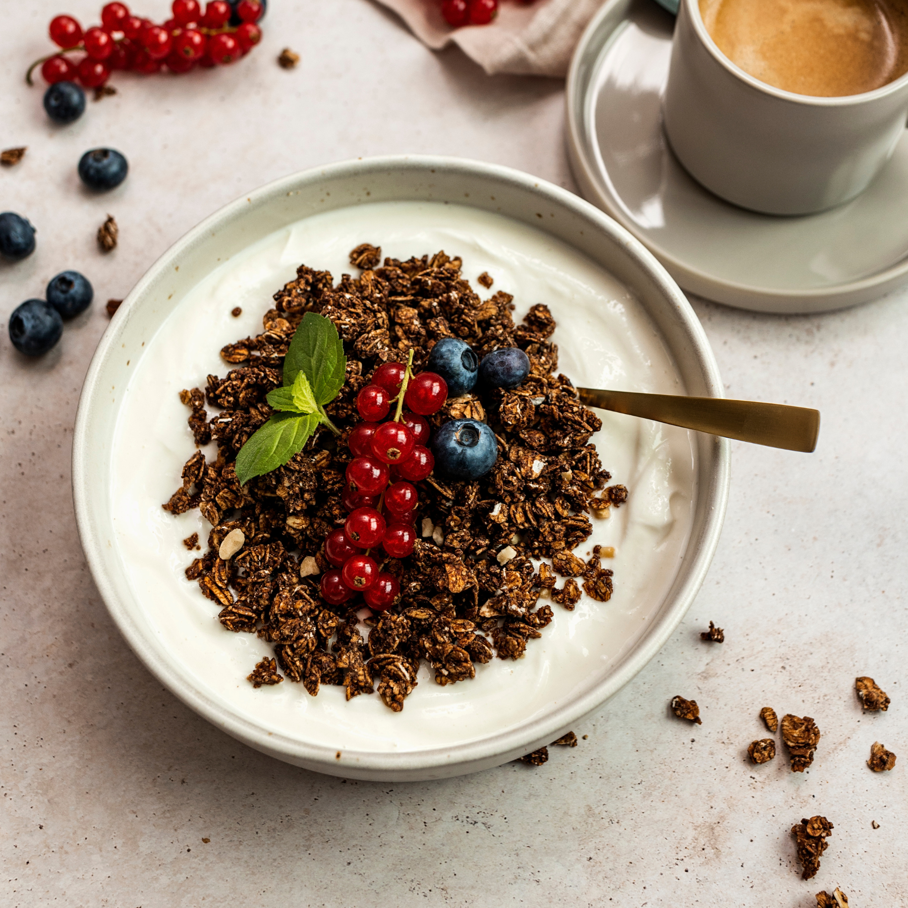 - Krokante granola van volkoren havervlokken, quinoa en amarant met een subtiele kaneel-kokosnoot