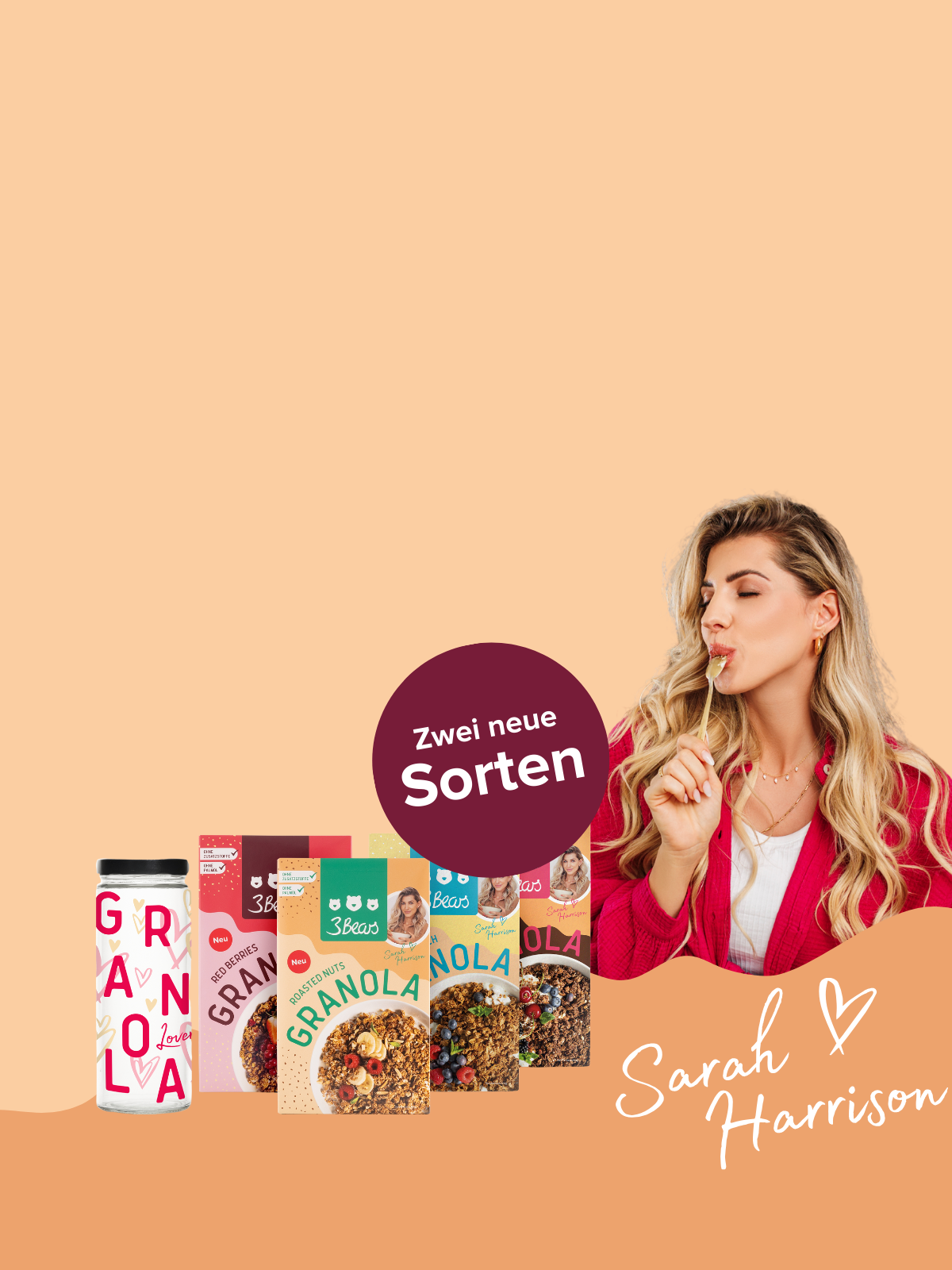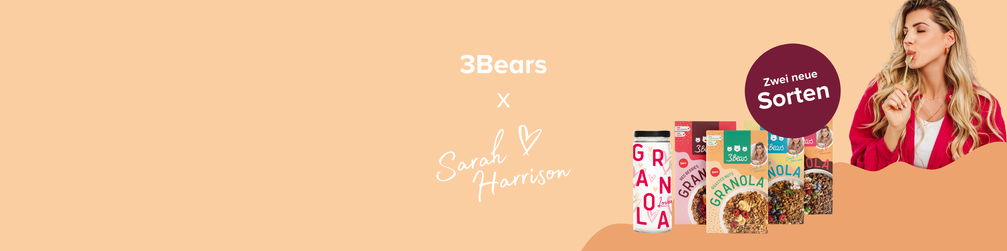 Dit zegt influencer Sarah Harrison over de granola die ze samen met 3Bears maakte: “Ik was al tijden op zoek naar een superlekkere, knapperige granola zonder bewerkte suiker. Helaas is het erg moeilijk om zoiets te vinden. Daarom ben ik bijzonder trots dat ik samen met 3Bears twee zulke fantastische rassen heb ontwikkeld! Je zult zien dat mijn granola smaakt alsof hij zelfgemaakt is en heerlijk gevarieerd is. Probeer het eens met yoghurt en vers fruit of gewoon rechtstreeks uit de verpakking!”