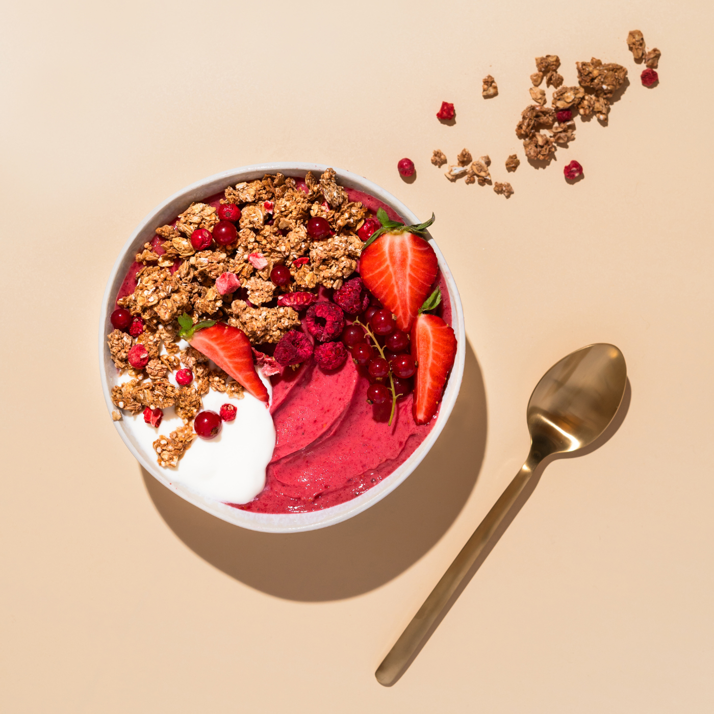 - Crunchy Granola made from wholegrain oat flakes with freeze-dried strawberries & red currants, quinoa and amaranth