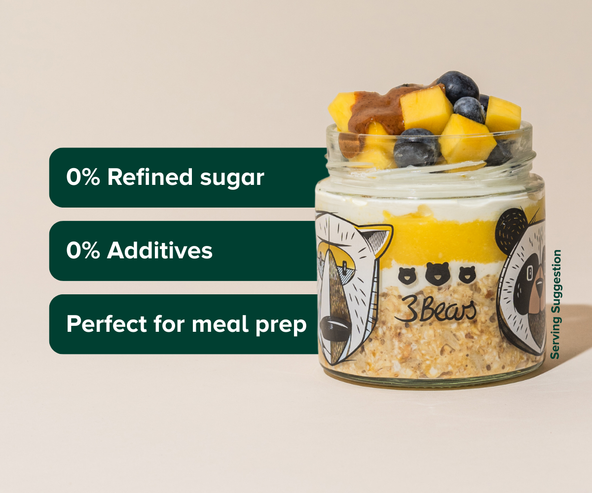 In the land of delicious breakfasts, our 3Bears Overnight Oats Jar - Community Edition is a magical helper, co-created with our 3Bears community. Adorned with the three friendly bears, this jar shows you exactly how to prepare your perfect overnight oats—just right! With handy markings for 50g of porridge mix, 100ml of liquid, and your favourite toppings, there’s no need to fuss with weighing or measuring. Tuck it into the fridge for at least 6 hours and wake up to a breakfast fit for Goldilocks herself. Once enjoyed, simply pop it in the dishwasher or wash by hand.Care Tips