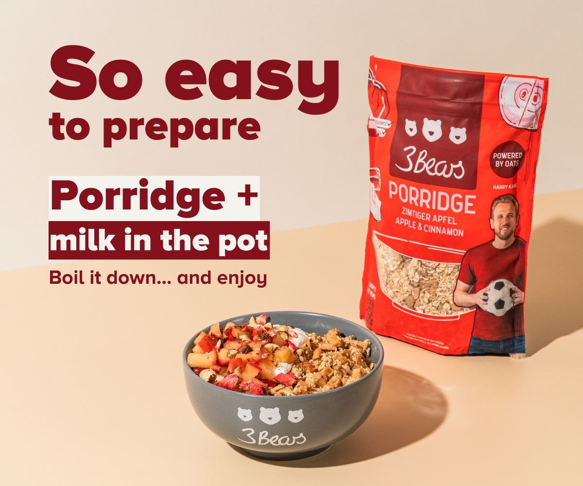We founded 3Bears in 2016 because we were frustrated with how much sugar was in so many foods. We brought porridge to Germany because we think it's the perfect basis for a wholesome breakfast. You can now get pretty much everything to do with oats from us: overnight oats, bars, granola and accessories. And you can trust us to always stick to our principles. Our products contain no industrial sugar, no additives, they are always 100% plant-based and sustainability is deeply rooted in us.