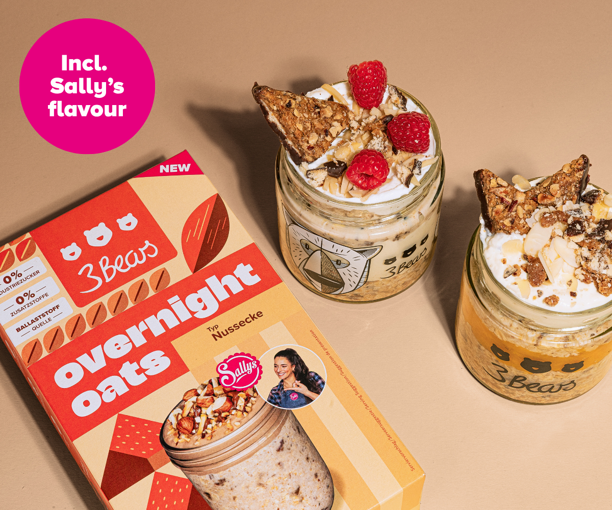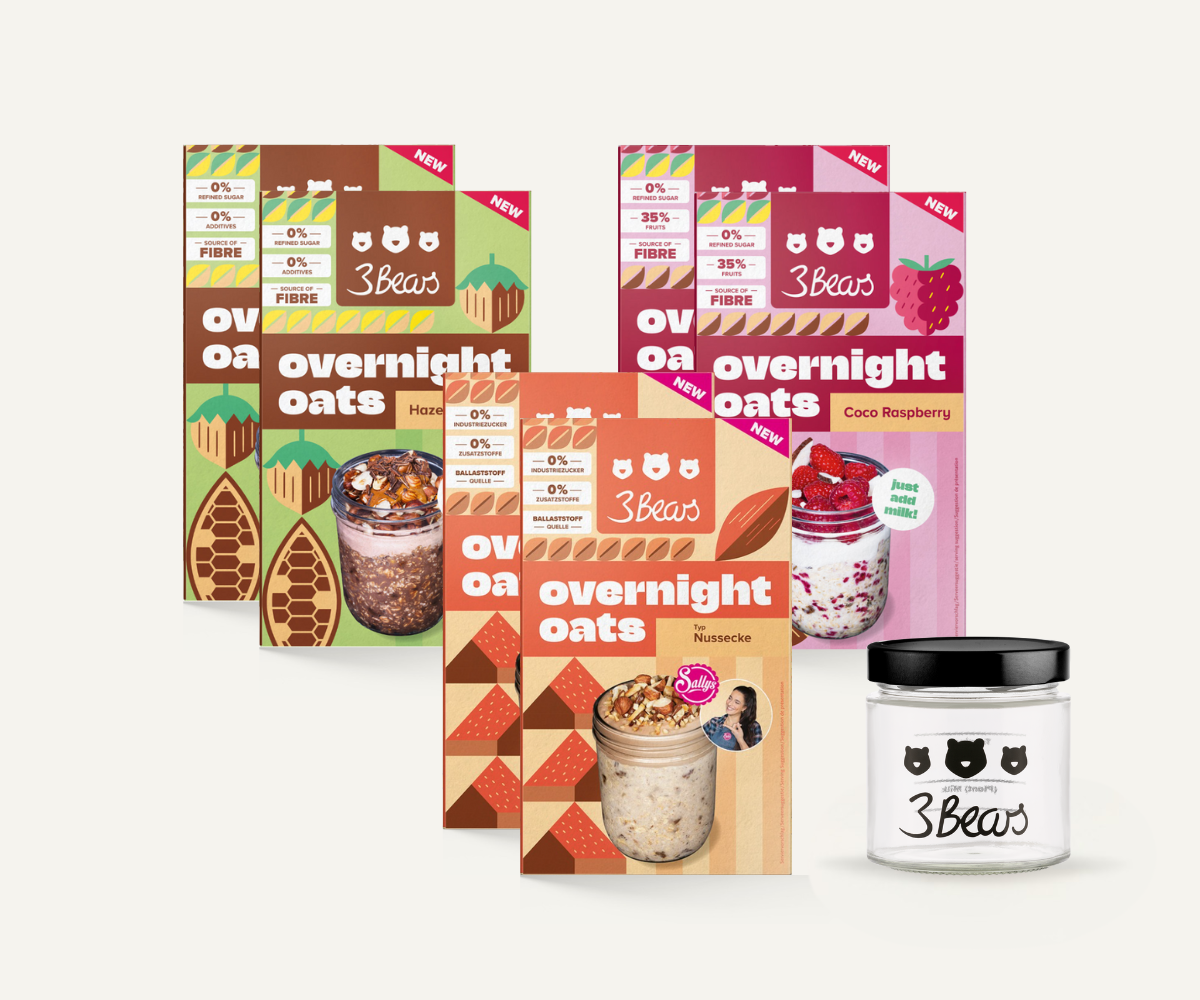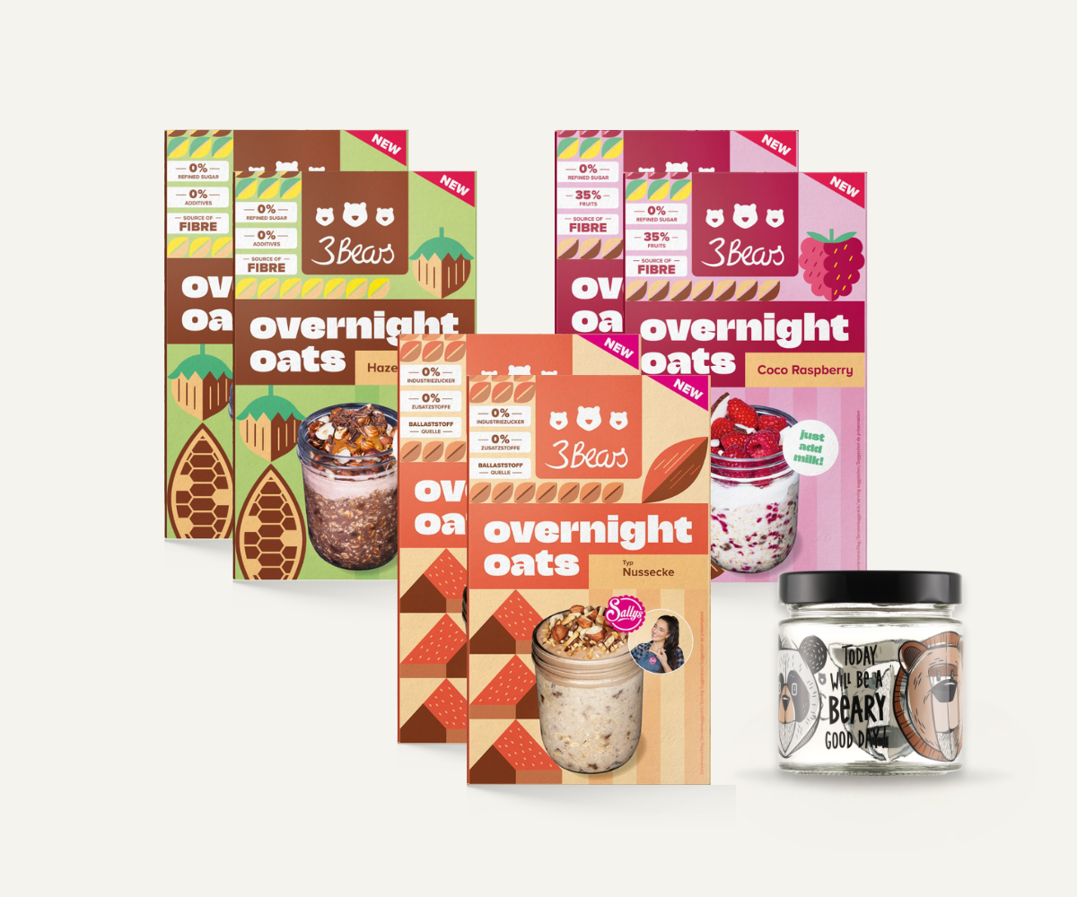 Plus two other bestsellers: Hazelnut Cocoa for all cocoa fans and Coconut Raspberry for a fruity-fresh start to the day. And with the 3Bears Overnight Oats jar, preparation is a breeze – simply prepare in the evening, leave to soak overnight and enjoy in the morning.
